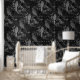 De beaux oiseaux dans les tons gris et blanc sont formés de motifs de feuilles et s'assoient entre branches et feuilles dans un style impressionniste sur un arrière - plan moody gris noir et charbon de bois pour faire ce beau et sophistiqué papier peint romantique à thème nature.