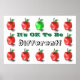 Text reads: "It's OK To Be Differentl!" on this poster print sign with cute red apples, with one green apple in the middle, border illustration all on a white background. Or customize with any text. Shown green bold 3d look text and/or colour can easily be changed also. The word "Different" is in another font than "It's Ok To Be" . Easily create your own personal message, award, or sign, or make one for the perfect gift for someone special. Lots of possibilities!
