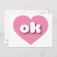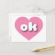 This postcard features a calm, cool pink heart containing the bold, rounded, white lower case letters ok, a playful version of the abbreviation for Oklahoma, the sooner state. The reverse side of the postcard is blank, awaiting your customized text or handwritten sentiments.