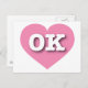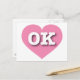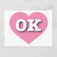 This postcard features a calm, cool pink heart containing the bold, white, upper case letters OK, the official abbreviation for Oklahoma, the sooner state.