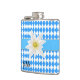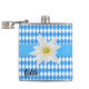 Oktoberfest themed drinking flask done in the classic blue and white diamond pattern for Oktoberfest, with graphics of a blue satin looking ribbon across the middle. Graphics of a single white edelweiss bloom, decorates the middle front of the flask. Personalize the custom black text, on the front, for yourself or as a charming gift idea for her.