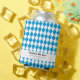 Oktoberfest Can Cooler personalized your custom text and gothic medieval style typography. Design features a diamond lozenge pattern in Bayern blue and white. Ideal for personal use or business promotion.