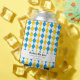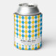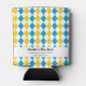 Oktoberfest Can Cooler personalized your custom text and gothic medieval style typography. Design features a diamond lozenge pattern in Bayern blue, white and yellow. Ideal for personal use or business promotion.