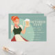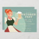 Oktoberfest invitations a woman holding a beer. Background is shades of green.