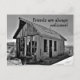 An old and destroyed abandoned shack like building on a post card that says "Friends are always welcome!" Customizable so you can change the text.