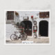 Postcard of an old bicycle and a white art store storefront in the city of Ostuni in Apulia, Italy with a white edge and in a white box the text 'Apulia'.