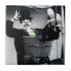 Funny photograph of a clown wearing a top hat. All but the red nose and green stripe shirt is black and white.