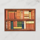 Professional business card for a bookstore, used books shop, library or librarian, teacher or writer, featuring a vintage illustration of colourful old books on antique wooden bookshelf.