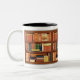 Custom mug featuring a realistic vintage illustration of wooden bookshelves filled with colourful old books. A fun gift for an avid reader, teacher, librarian, writer, or any book lover.