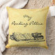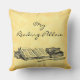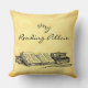A custom pillow for readers with script letters and vintage art of books and a feather writing quill in black on a faux parchment background, for book lovers and librarians. Customize it to change fonts, background colours and more.