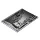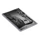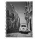 Photo notebook with an old Renault 4 car in a small street towards the sea in a small southern italian town, Polignano a Mare in Apulia, Italy in black and white.