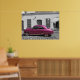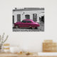 A pink or purple car is parked in the sunshine in the old town of Trinidad in Cuba. The background is turned into black and white to let the car stand out more.