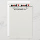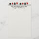 This humourous stationery is for all card players. It would make a great inexpensive small gift or stocking stuffer for poker players, bridge , canasta or solitaire players. At the top is a row of card symbols; black spades, red diamonds, black clubs and red hearts. The text says "Old card players never die; they just shuffle away." You can change the text and/or the background colour if you want. See other small gifts in my "Small gifts and Stocking Stuffers" collection.