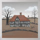 Colourful artwork of an old timber-framed farmhouse in the English countryside, with an old windmill in the background, and some crows who have come to visit. Perfect for anyone who loves folk art.