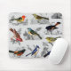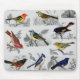 An old fashioned collage of vintage bird drawings. Colourful birds on a grey and black and white background. These drawings of finches, swallows, warblers, orioles, jays and more birds are from the vintage Arm and Hammer Baking Soda advertising card series Birds of America.