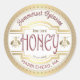 Old-fashioned label design flanked with stylized gold honeybees. Gold Border. Personalize with your apiary business name at the top and add in your location and honey net weight below.