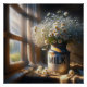 Daisy and baby's breath bouquet in old metal milk can by a sunny rustic farmhouse window