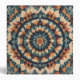 A vibrant geometric quilt pattern radiates from the centre, creating an intricate mandala design with various colours, including teal green, rust brown, and beige shades.