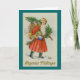 This vintage Victorian era Christmas card features a non-traditional Santa . He appears to be carrying a pack of gifts and a tree as he treks through the snow on foot.
