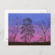 A watercolor painting of an old fence row and autumn trees silhouetted against the pinks and deepening blues of the evening, twilight sky adorns this postcard!