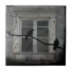 Crows can be seen the outside of a old grey and grungy window on this industrial themed tile.