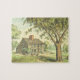 This vintage look puzzle design depicts an outdoor scene featuring an old house and a tree.