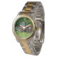 Very good quality watch that looks good whether dressing up or down. The band is sturdy. The watch is rather large so might not work for smaller folks. Recommended as a good gift. Printing is just a touch light but adds a nice touch of personalization.