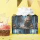 An elderly man dressed warmly sits on a log in a snowy forest with a bunny holding a glowing pine cone resembling a small Christmas tree.