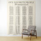 The phrase “Our Favorite People” paired with “We saved you a seat” sets a warm, thoughtful tone. With room for up to 12 tables with 10 guests each, keep you guest list organized and easy to read, while the flowing fabric drape adds softness and movement that elevates your décor.