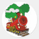 A cute cartoon train with number 9 on the front and smoke coming from the stack and trees in the background.