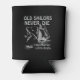 A graphic illustration of sailboat, dinghy, and old sailor by artist/designer Charmaine Paulson on a can cooler. The cooler has the text “Old sailors never die-they just get a little dinghy” ©2013charmainepaulson