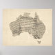 A map of Australia made from a collage of old and vintage sheet music, including some handwritten scores and notes, on an antique style background.