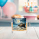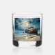 This old ship whiskey glass is decorated with a an old wooden ship beached on the shore with a full moon rising. The image is on both sides and "Cheers to the ole ships" and "May they rest in peace" is printed on both sides. This image is very impressive and stunning.