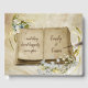 Vintage wedding album with names, feather fountain pen and flowers on textured sepia background