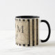 This nautical monogram ceramic mug features a black and beige striped background with a black anchor in the centre and world map overlay. Personalize the monogram with your own initials. Designed by world renowned artist Tim Coffey.
