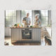 The image depicts a modern kitchen scene with an older couple and two cats. The kitchen has large windows allowing ample natural light, grey cabinetry, and stainless steel appliances including an oven with a visible roast inside. On the countertop, there is an assortment of vegetables and cooking utensils suggesting meal preparation is underway. One individual appears to be stirring a pot on the stove while the other is chopping vegetables. A cat sits on the floor observing the scene.