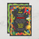 Bright and colourful Mexican fiesta party invitation with sugar skull, maracas, piñata, margarita, taco, chili pepper, guitar, sombrero,cactus with streamers on a black background. Perfect for any Mexican themed party! Hand drawn illustration by McBooboo