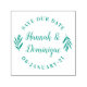 This formal rubber stamp features your names in a calligraphy script font framed by "SAVE OUR DATE", your special date and two elegant olive branches. Customize this classic design by typing your details into the template boxes.