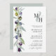Olive Branch Symbol of Love Monogram Wedding Invitation with QR Code RSVP on Back... The front of our botanical monogram wedding invitation features the bride's and groom's initials overlaid on a pastel ampersand above personalized invitation text in black serif and sans serif typography on a white background. Bordering the invitation text on the left is a beautiful watercolor olive branch in shades of dusty green, dark blue, and purple. The light dusty green back of the invitation includes your wedding website QR code as well as the website's URL allowing your invitees to easily RSVP online and view all of the details normally sent in a wedding packet. The example QR code and all example text (aside from the ampersand and calligraphy elements) can be easily revised with your own information on the personalization template.