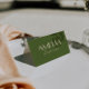 Classy and fancy wedding place card designed for a clean and elegant old money reception table setting. This folded escort card features a handwritten script wedding name paired with contemporary typography. The olive green wedding decor adds a fresh, stylish touch to your wedding. Perfect as a custom guest name card for a chic and simple wedding celebration. Use this elegant folded place card to elevate your modern reception table decor. A sophisticated contemporary wedding table card that complements any minimalist wedding theme.