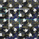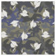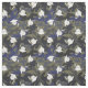 Camouflage graduation fabric in fields of blue, charcoal, and olive green and a pattern of white graduation caps.