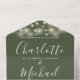 All in one wedding invitation featuring pretty string lights, elegant signature script name and monogram initials on an olive green background. The invitation includes a perforated RSVP card that can be individually addressed or left blank for you to handwrite your guest's address details. Designed by Thisisnotme©