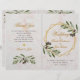 The titles and the names of the bride and groom are written in a golden elegant calligraphic script. It has the wedding ceremony and the wedding party on the inside and a thank you message on the back cover, with a small gold heart above the names.