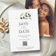 Announce your big day in style with these QR code save the dates, blending modern, minimalist, and elegant design elements. Featuring a favourite engagement photo and original hand-painted watercolor olive branch artwork by Victoria Grigaliunas, these olive save the date invitations are a fresh yet timeless choice. The layout combines classic serif and script typography on a crisp white background for a clean, sophisticated look.