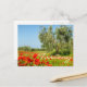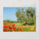 Postcard of an old olive tree in a poppy field full of vibrant red poppies in a landscape in Tuscany, Italy with the text: 'Tuscany'.