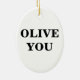 Dites, "je t'aime !" avec cette olive adorable vous ornement de Noël. Les caractéristiques de conception avant une olive géante, texturisée, verte avec un piment rouge et en forme de coeur. Le bord opposé comporte les mots, "olive vous." Ma qualité ! L'intelligence ne finira-t-elle jamais ?