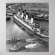 RMS Olympic is being assisted to sea for her trials. There was a limit to what I could do to make this image suitable for display. The original was from a newspaper clipping, so the image was comprised of half-tone dots and the occasional large blotch. You won't be able to cover a wall with this picture, but it will make an excellent (and unique) small display. And special thanks to a Zazzle user who alerted me to a mistake in my captioning of the image. This ship is Olympic, not Titanic. I apologize to all for the confusion. The mistake was unintentional. I was relying on the information included with the article associated with the image.