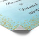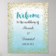 Poster print for welcome wedding sign with faux gold glitter design and ombre blue watercolor background.