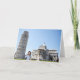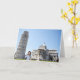 The famous Leaning Tower of Pisa stands prominently to the left, with an individual playfully posing in front of it, shocked at the amount it's leaning. The adjacent cathedral adds to the historic architectural beauty of the scene.