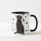 A black Labrador Retriever Dog looks out at you from two sides of this mug. The text between the two images says "On the 8th day, God created the LABRADOR RETRIEVER and called it VERY GOOD". The dog images and the white oval banner containing the text fields are placed on a white background with black paw prints.